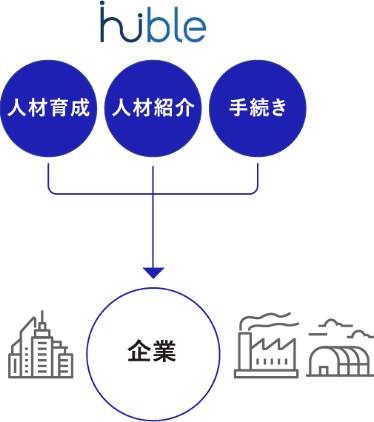 アジアの優秀な人材が日本で活躍するためには、透明性の高い現地の送り出しシステムが必要です。hubleは信頼のおけるアジアとのネットワークを独自に再構築し、現地での人選と教育、オンラインによる直接面談、入国手続き、就業後のフォローまでを企業によりそいながら実現します。
