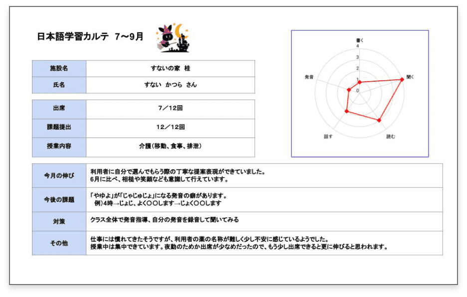 就業後も一人ひとりの日本語レベルを細かく把握するために、学習カルテを作成しています。定期的に課題と成長、対策を明確にすることで、さらなる語学力の向上や日本語能力試験の合格を支援しています。